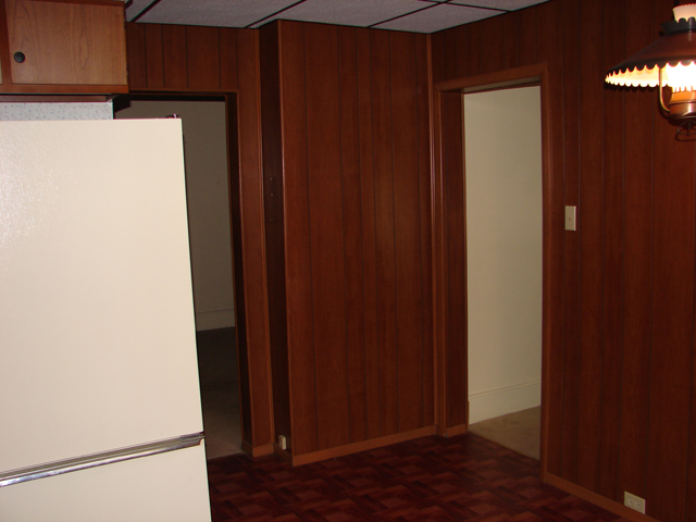 Kitchen with appliances, room size 11x12, one outside door, and one basement access door.